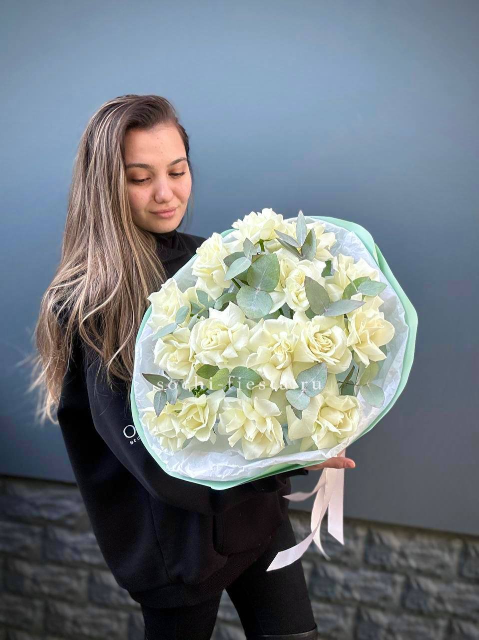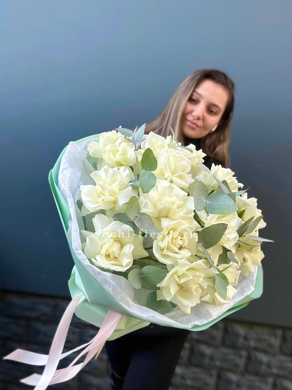 Французские розы Notte Bianca раскрываются широкими вывернутыми бутонами с фактурной глубиной. Эвкалипт добавляет графичности и подчёркивает архитектуру каждого цветка.