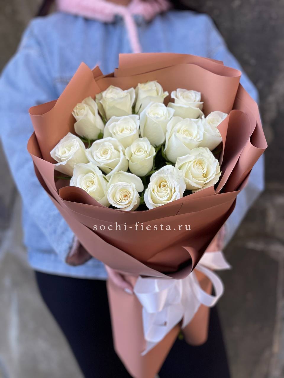 Двадцать пять белых роз образуют объёмную композицию с выразительным силуэтом. Плотная сборка и ритмичное расположение бутонов создают графичное впечатление.