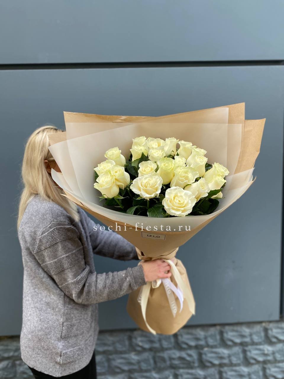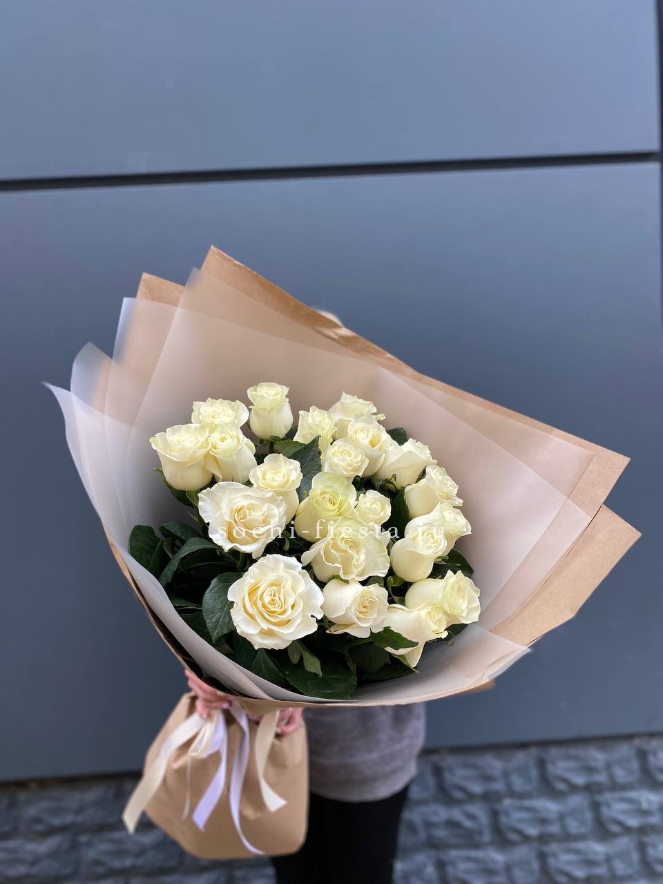 Тридцать один белый бутон формирует внушительную композицию, которая привлекает внимание своим присутствием. Букет выглядит цельно и заполняет собой любое пространство.