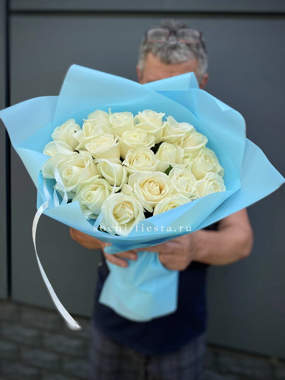 Пятнадцать белоснежных роз собраны в аккуратную форму с ровным силуэтом. Композиция сохраняет свежесть и держит структуру благодаря продуманному размещению бутонов в цилиндре.