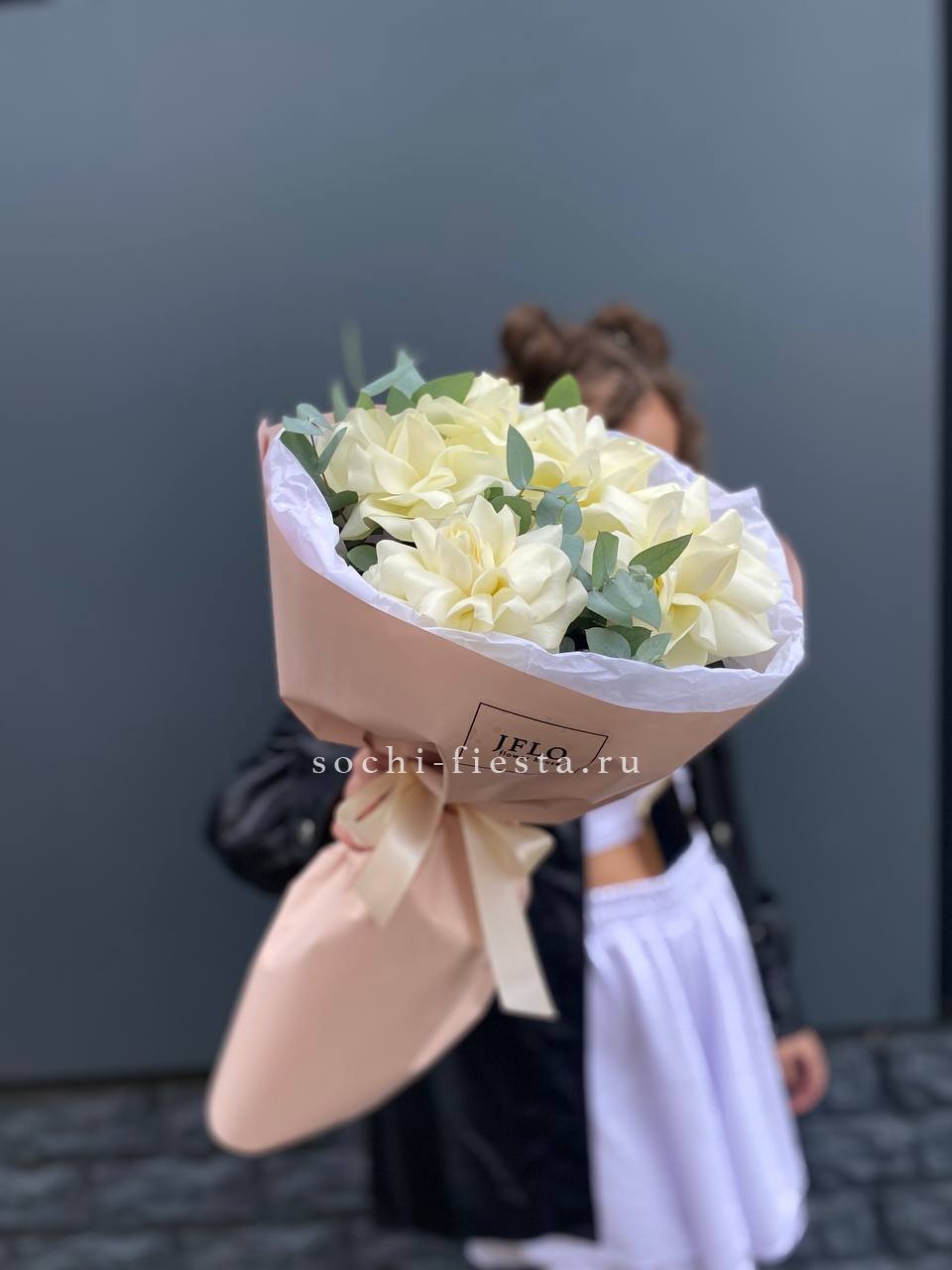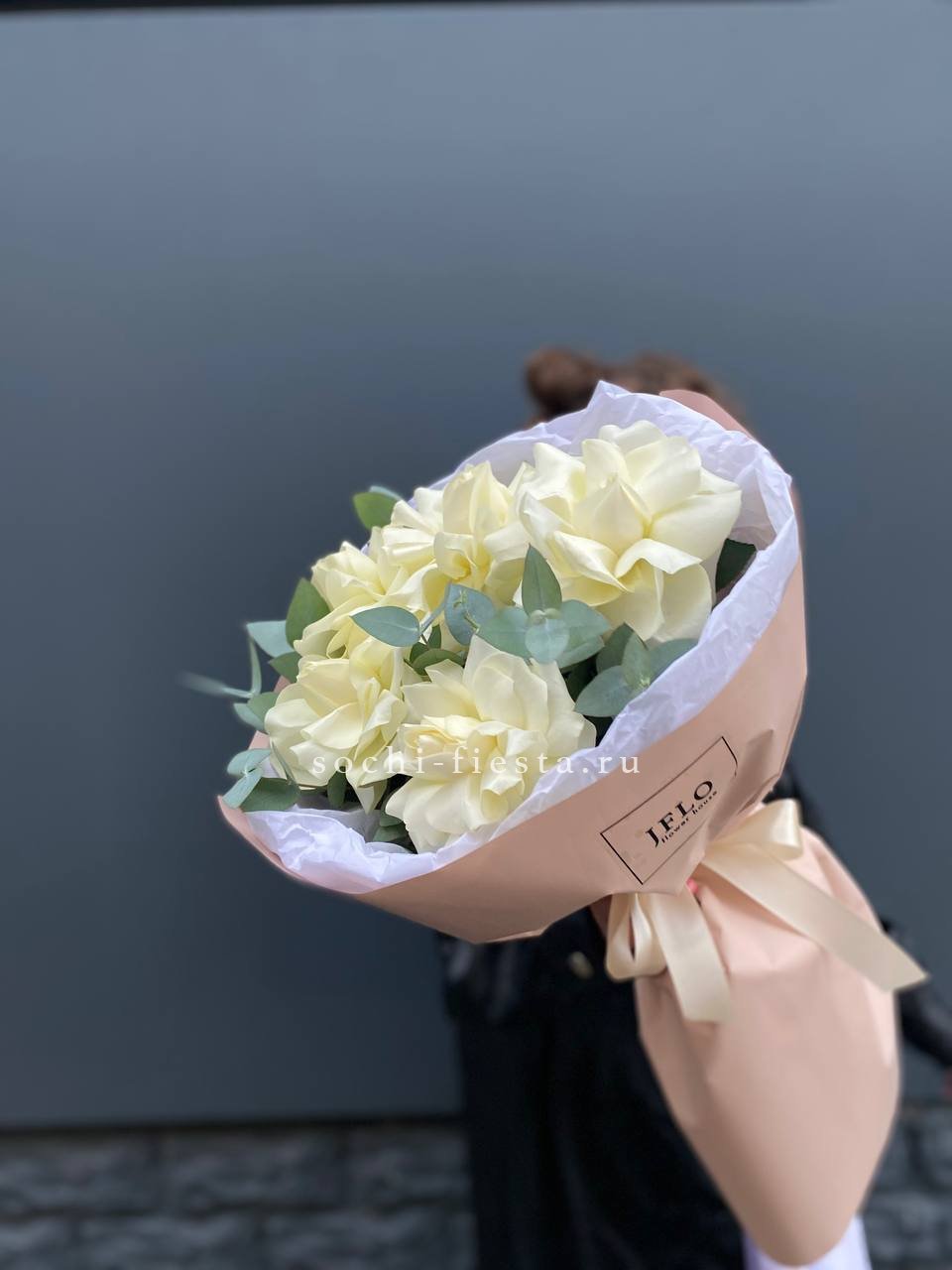 Пять французских роз с вывернутыми лепестками раскрываются широко и создают эффект лёгкой небрежности. Эвкалипт поддерживает форму и добавляет свежести белому цвету.
