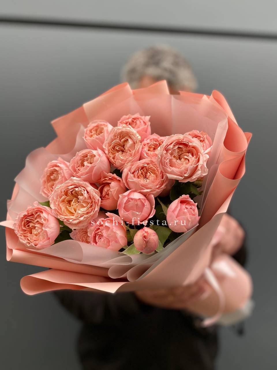Пять веток кустовой розы Джульетта в лаконичной сборке. Каждая ветвь раскрывается несколькими бутонами теплого персикового оттенка. Компактный формат для быстрого знака внимания.