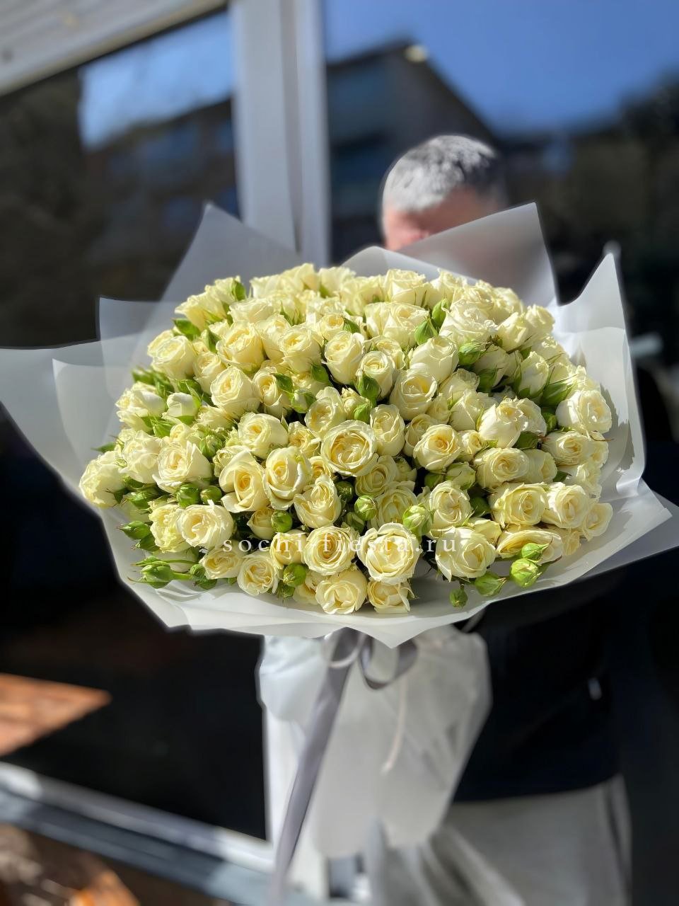 Тридцать пять пионовидных кустовых роз формируют объёмную композицию с густой текстурой. Плотно уложенные бутоны создают впечатление цветочного облака в дизайнерской упаковке.