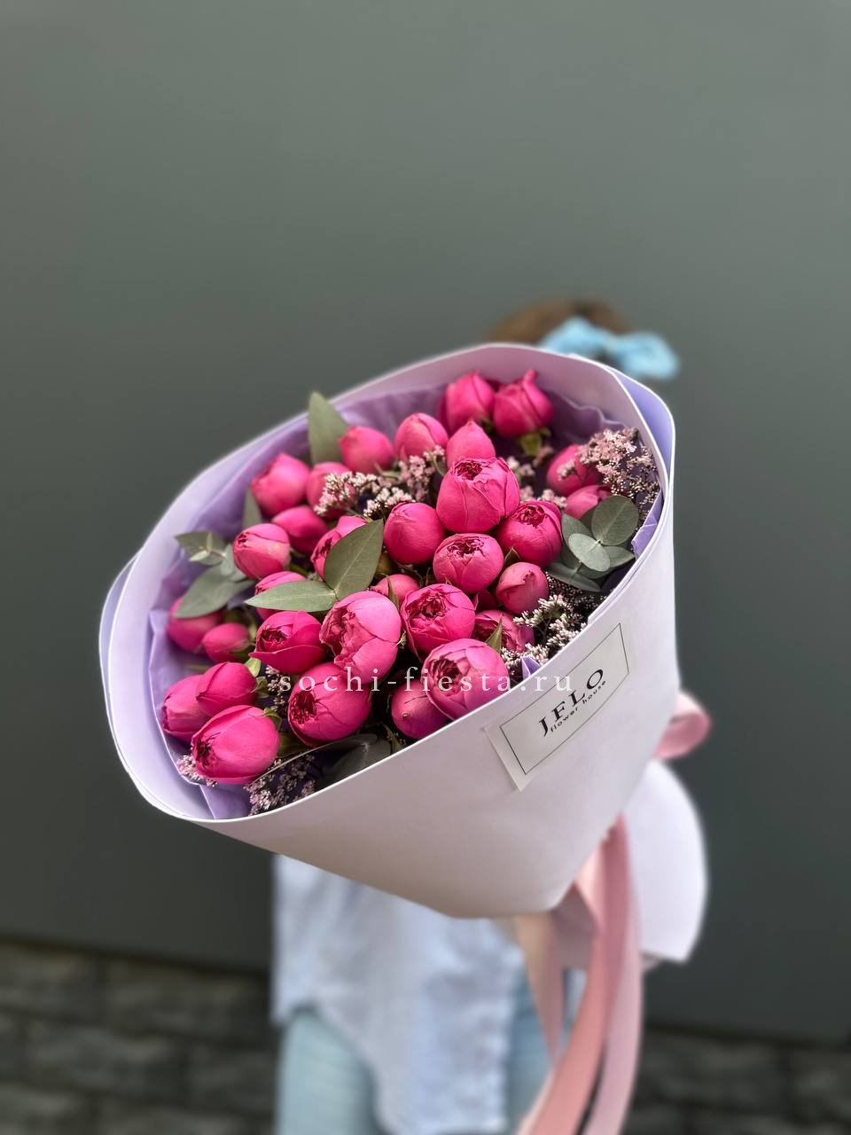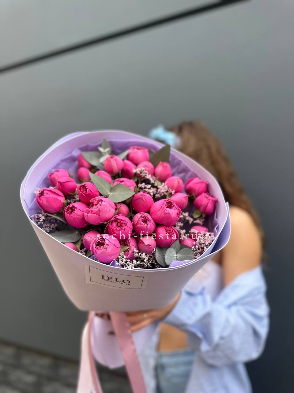 Минимальный состав: 35 пионовидных кустовых роз Мисти бабблс, лента, авторское оформление.