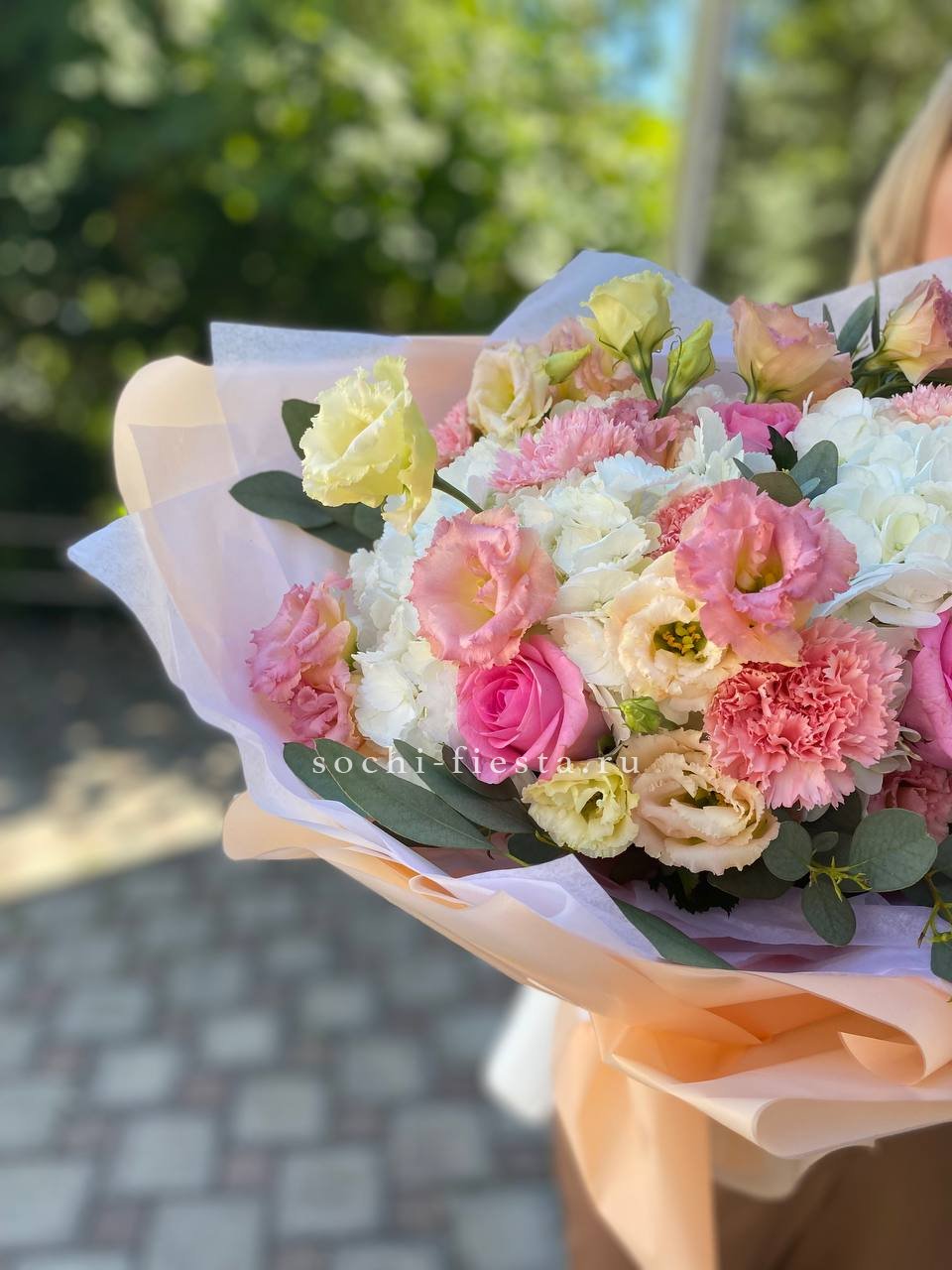 розовая роза, гортензия, диантус, эустома, эвкалипт, лента, дизайнерская упаковка.