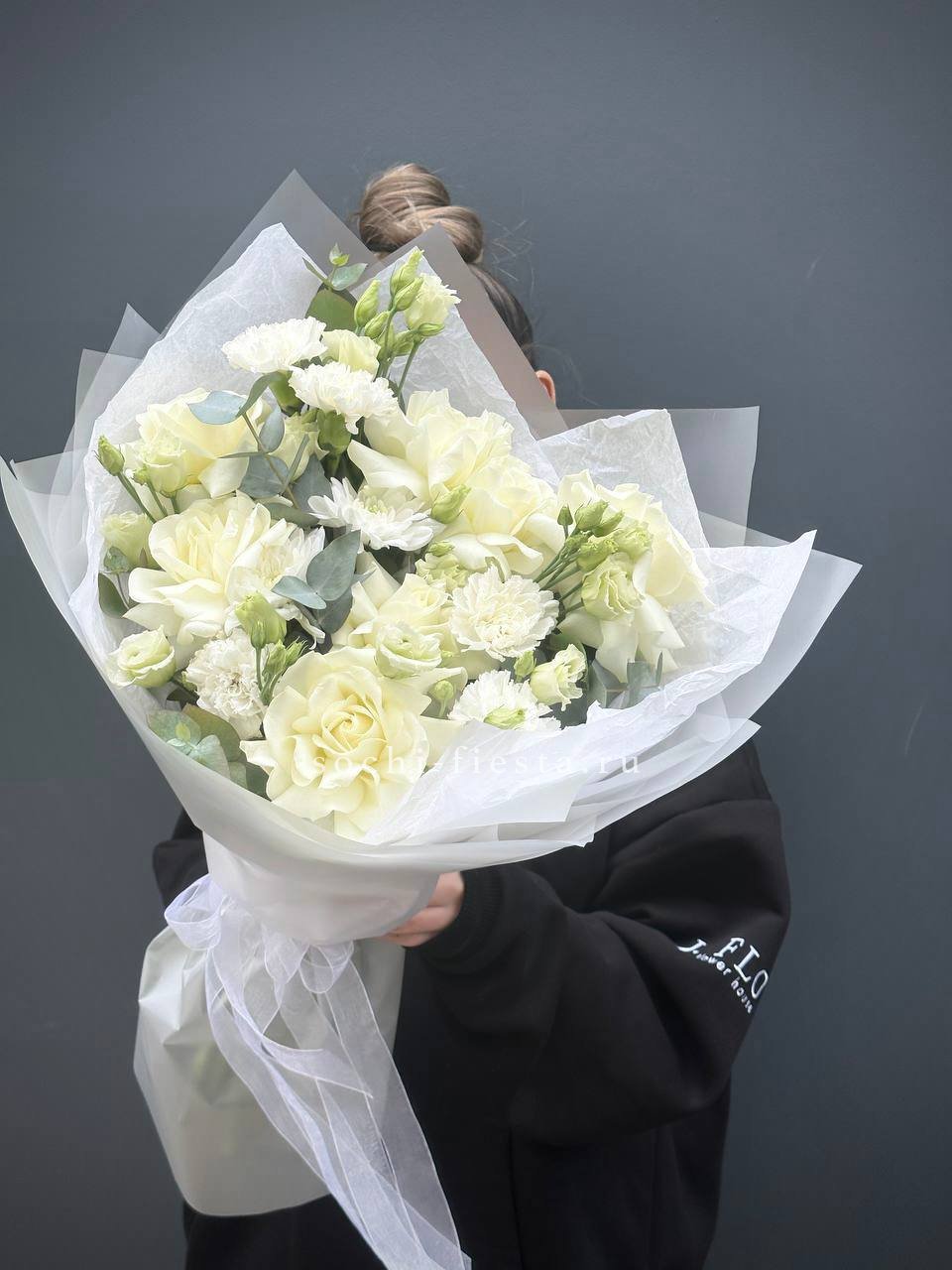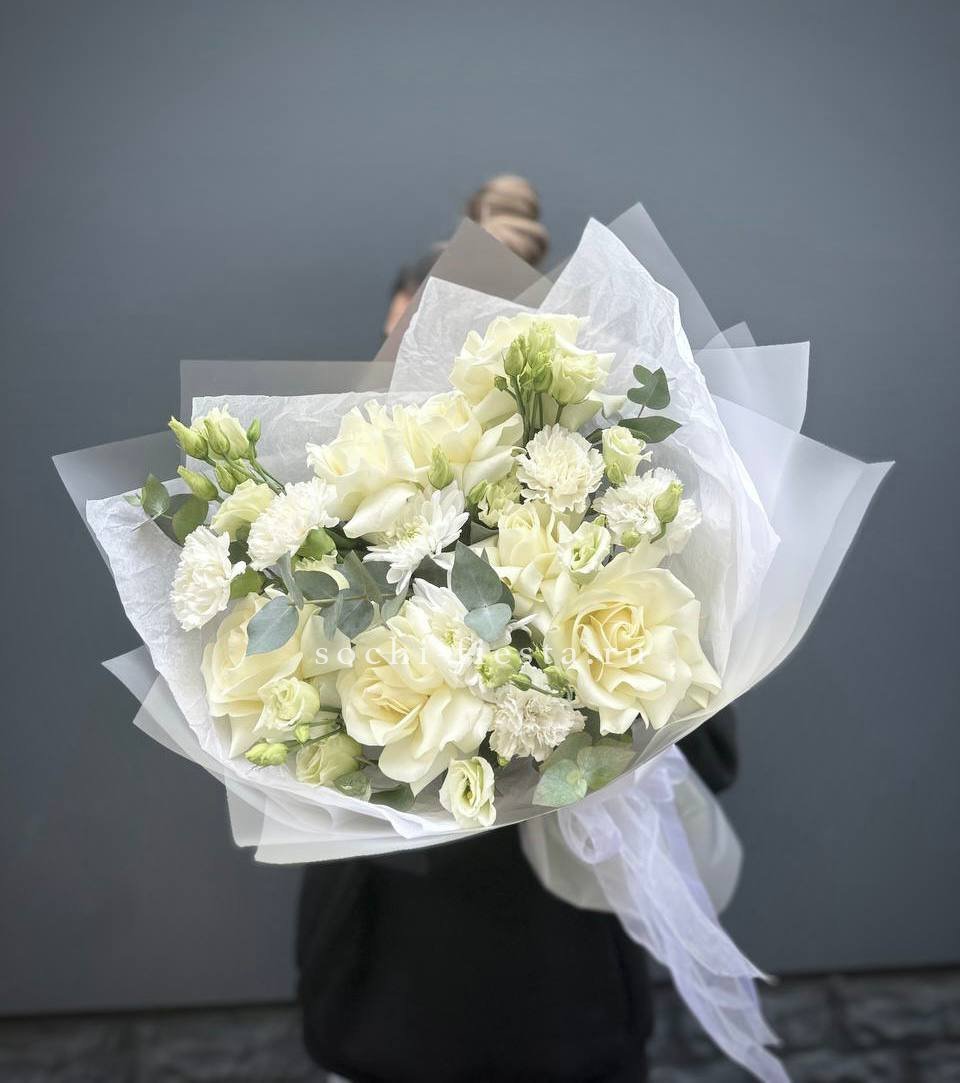 Белоснежные розы собраны в плотный круг и дополнены воздушными соцветиями кустовой хризантемы. Эвкалипт добавляет свежести и завершает композицию мягкими серебристыми оттенками. Букет держит форму и долго сохраняет безупречный вид.