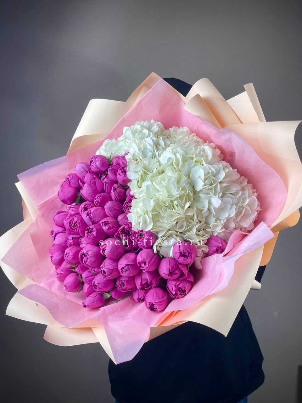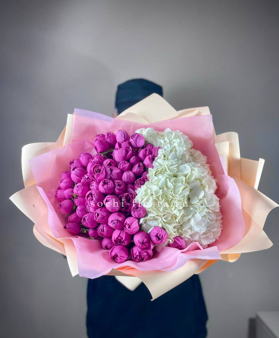 Пышные пионы встречаются с воздушными фрезиями в букете, который радует глаз многослойной структурой. Лепестки раскрываются постепенно, создавая живую композицию с выразительной глубиной.