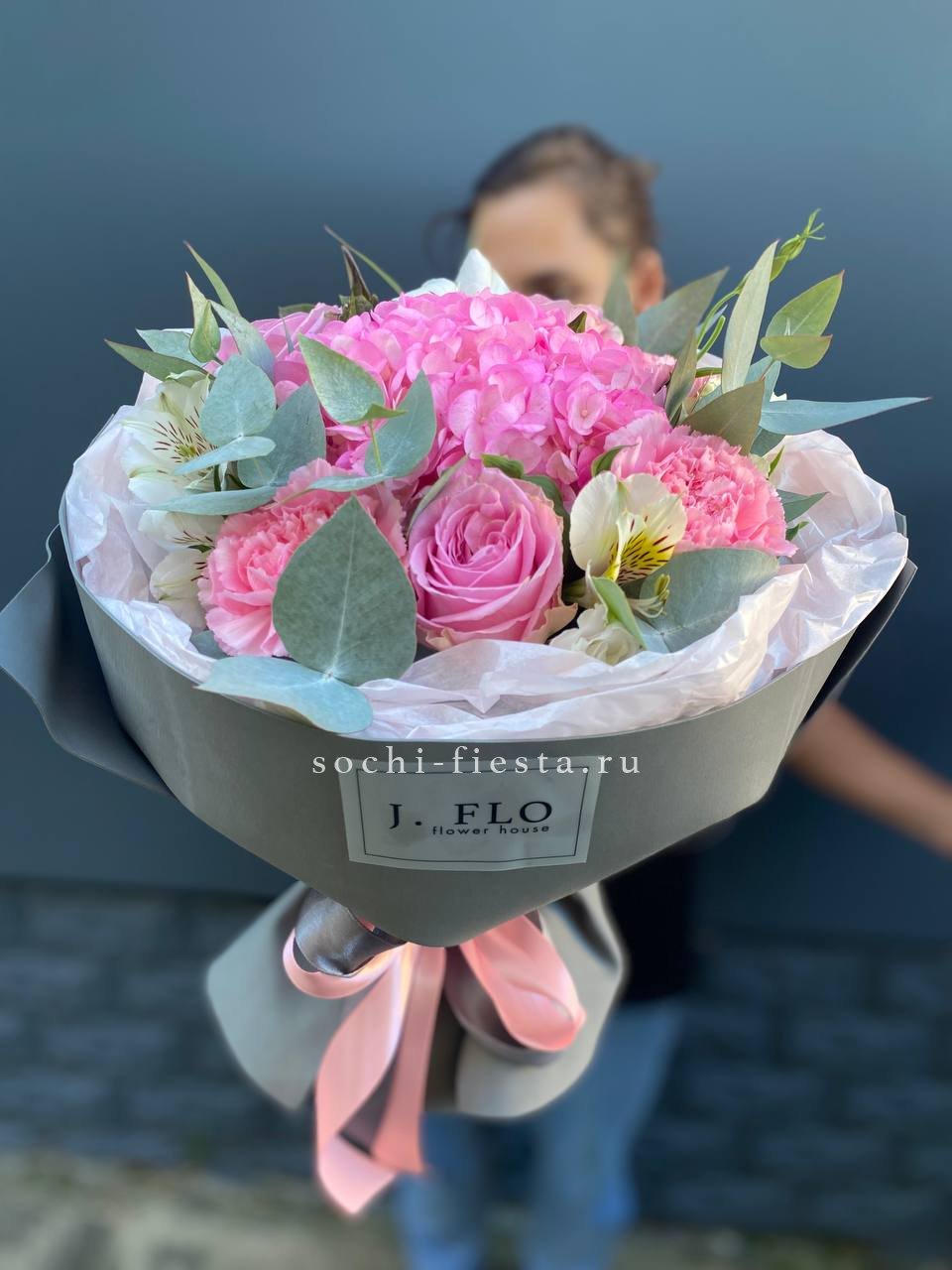 гортензия, хризантема, хамелациум, гербера, мисти баблс, диантус, пленка.