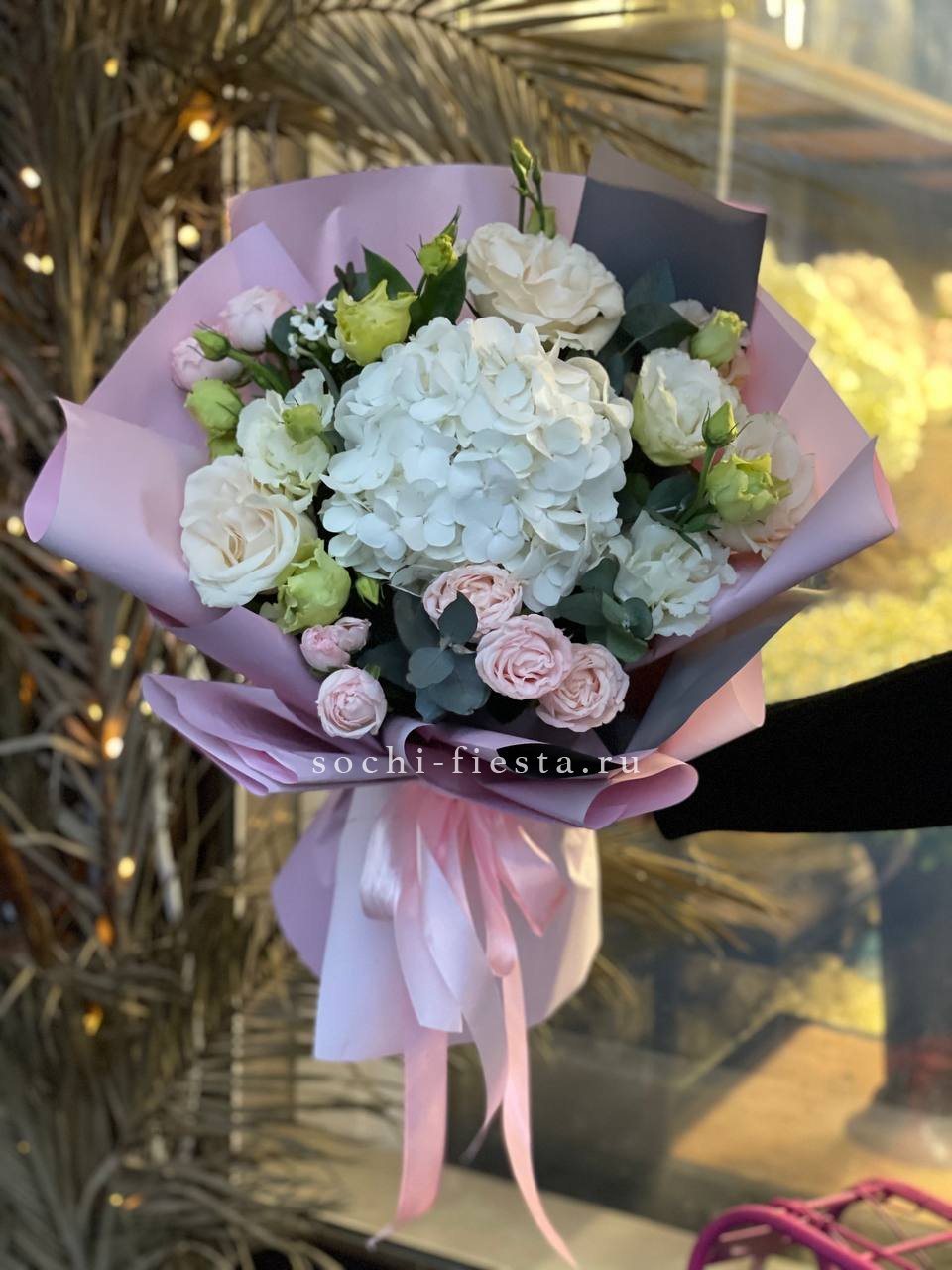 гортензия, бомбастик, диантусы, эвкалипт, антиринум, хризантема, пленка.