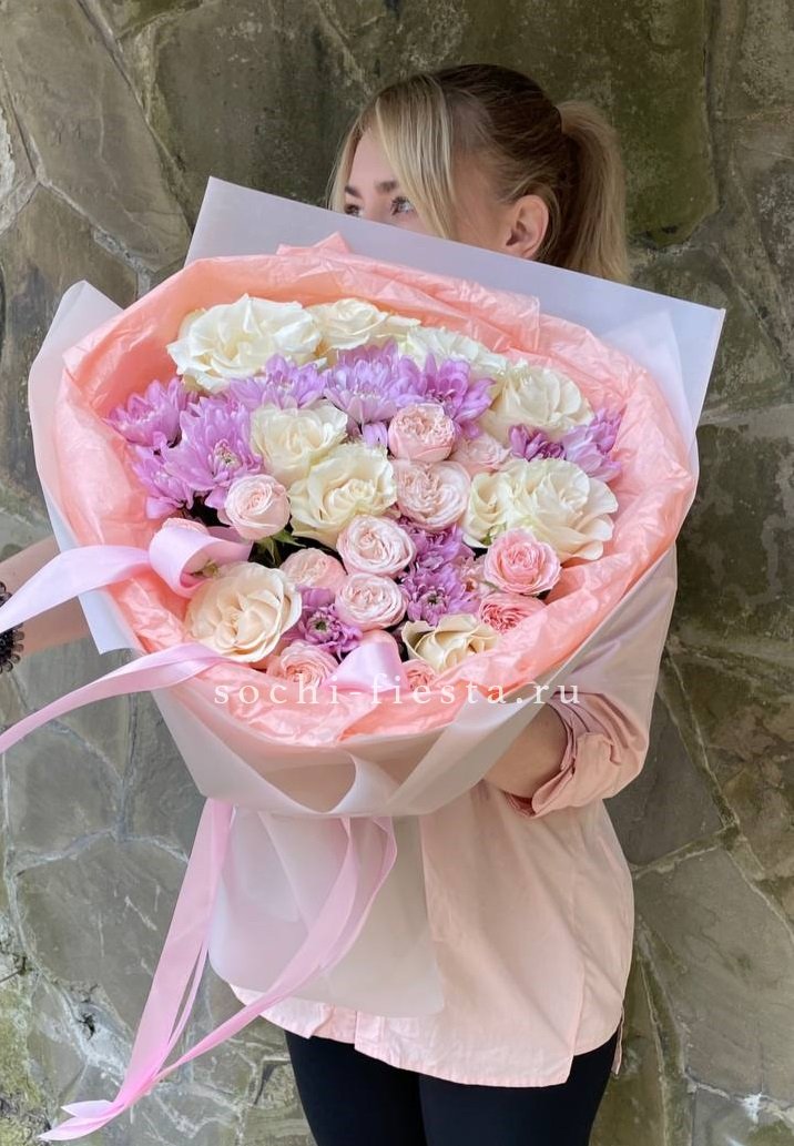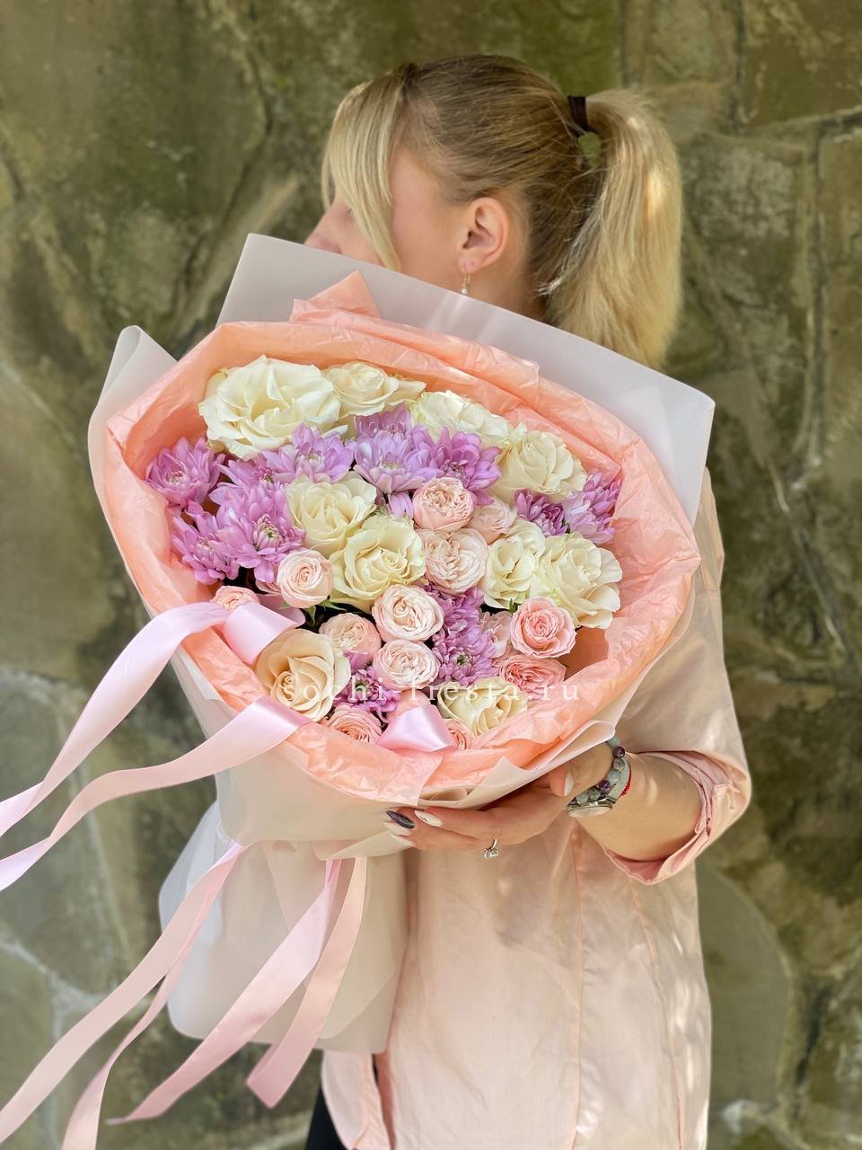 роза одноголовая, диантус, кустовые розы, сопутствующие сезонные цветы, лента, дизайнерская упаковка.