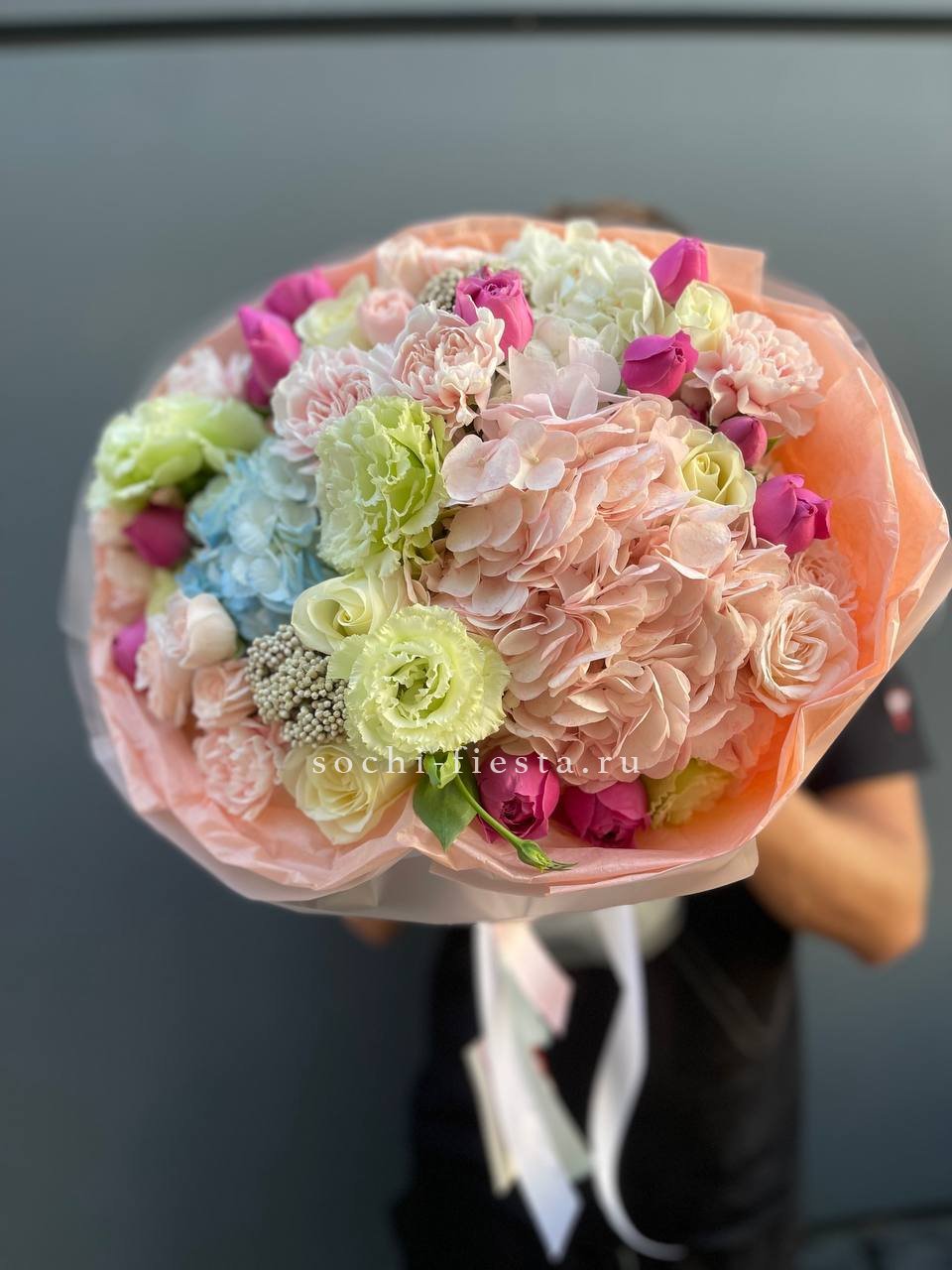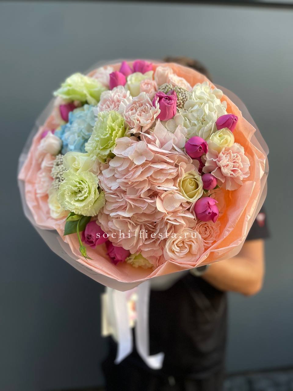 кустовые розы, гортензии, французские розы, диантусы, эустомы, лента и дизайнерская пленка.
