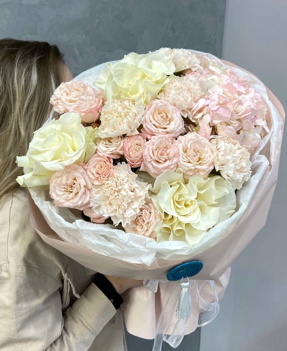 Монохромная палитра с многослойной структурой. Французские розы и эустомы чередуются с кустовыми бутонами, гортензии заполняют объём, а диантусы создают точечные акценты. Букет выглядит цельно и графично.