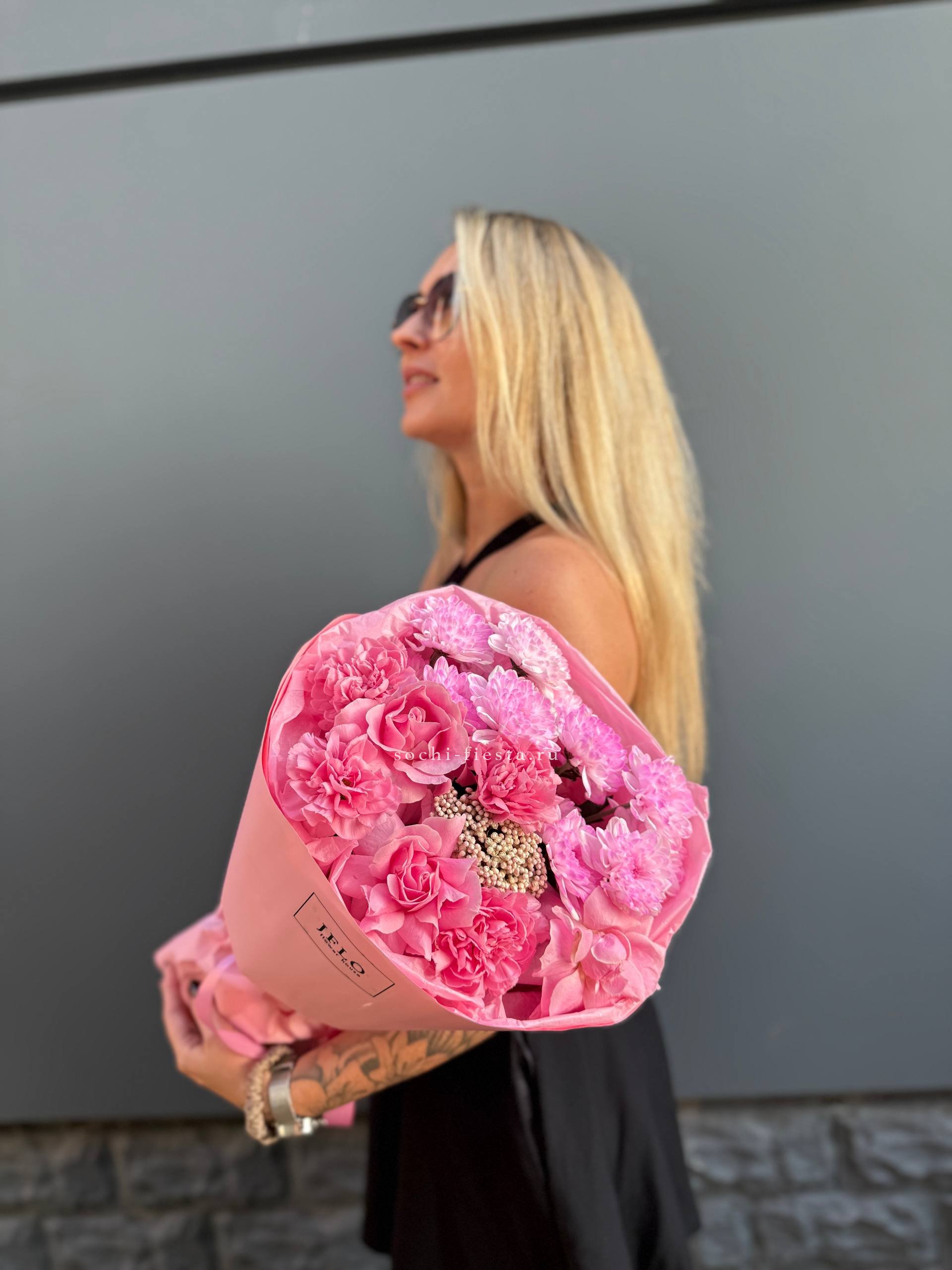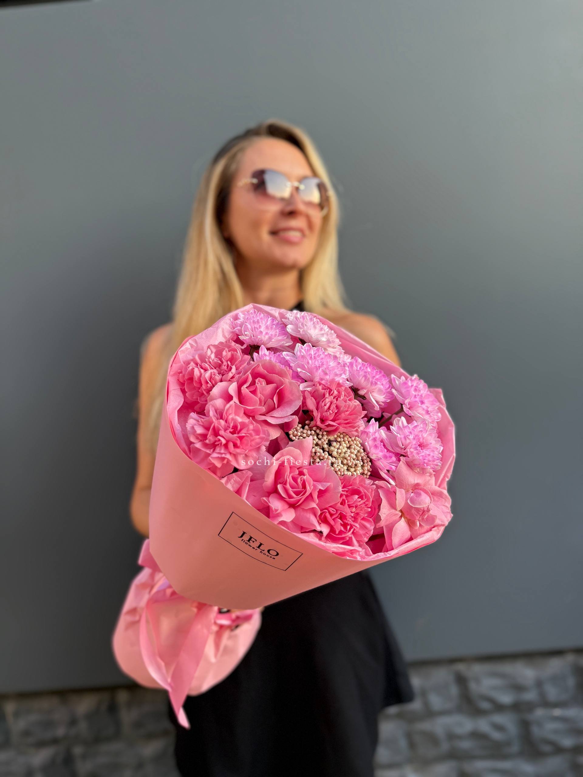 Хризантемы и розы переплетаются с диантусом и озотамнусом в букете насыщенных красок. Каждый цветок раскрывается по-своему, наполняя композицию движением и жизнью.
