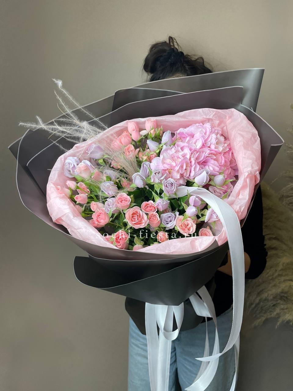 Гортензия образует пышную основу, сквозь которую проступают светлые головки эустомы и роз. Бомбастик вносит графичность, создавая объём и глубину.