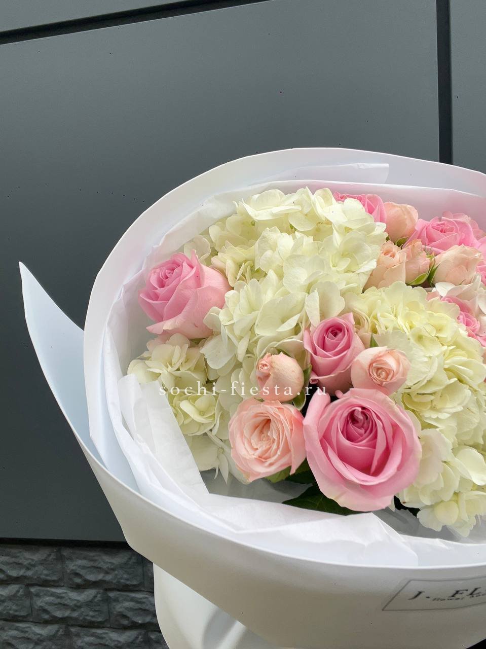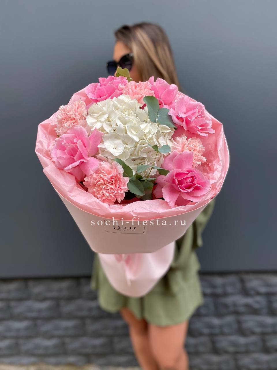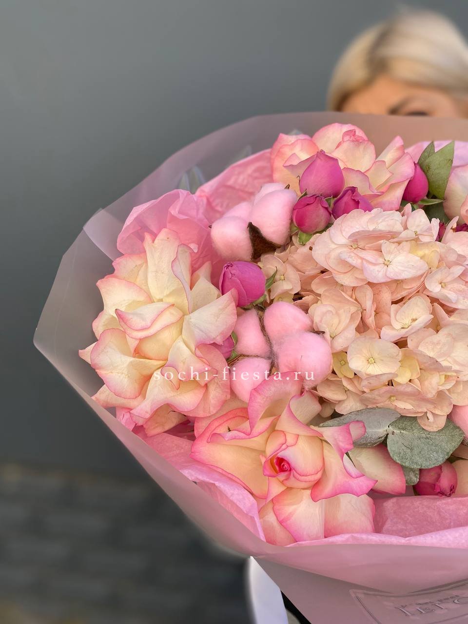 гортензия, мисти баблс, джумилия, эвкалипт, хлопок, упаковка.