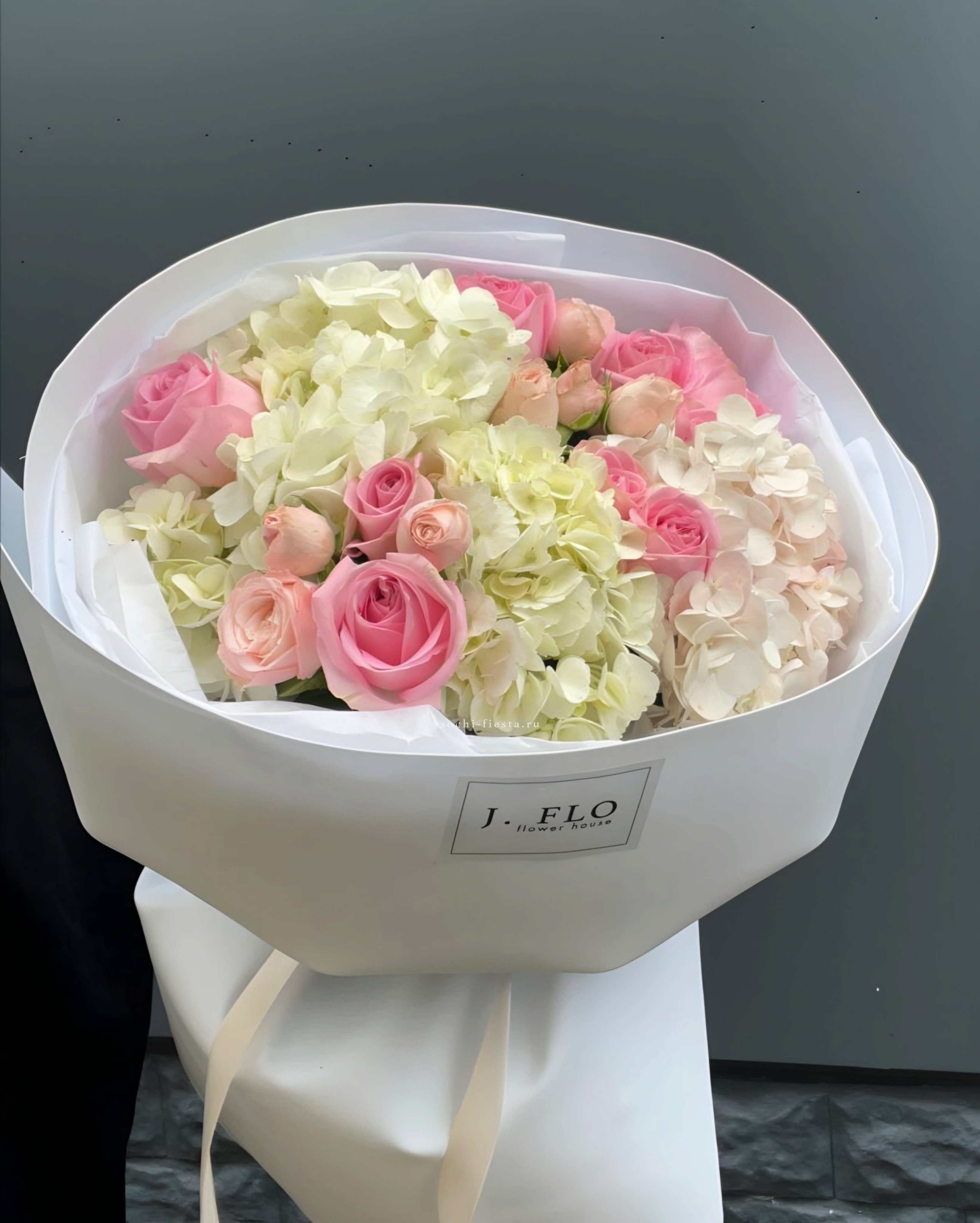 Крупные бутоны Джумилии соседствуют с воздушной гортензией и россыпью кустовых роз. Эвкалипт и хлопок создают спокойный фон для нежной палитры.