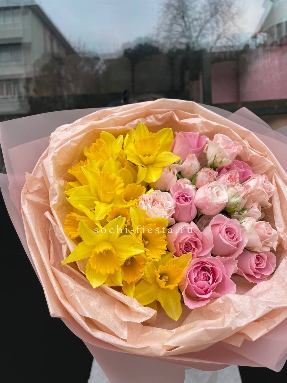Весенние нарциссы встречаются с бархатными розами в одном букете. Пионовидные бутоны добавляют округлости, а белые и жёлтые оттенки перетекают друг в друга, создавая лёгкое цветовое движение.
