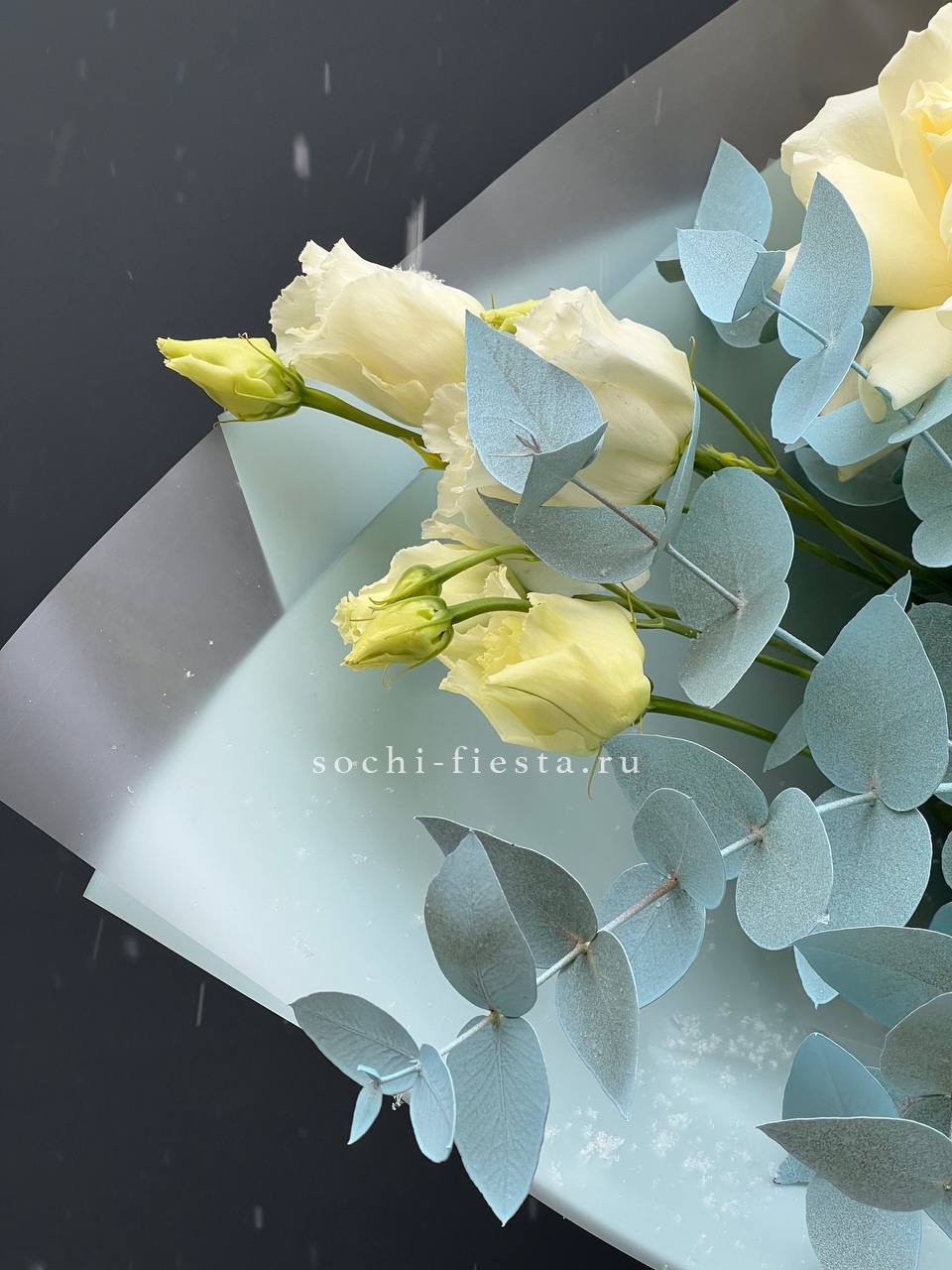 Белые французские розы с пышной гортензией и эустомой образуют воздушную композицию с мягкими переходами оттенков. Эвкалипт добавляет свежести и завершает форму.