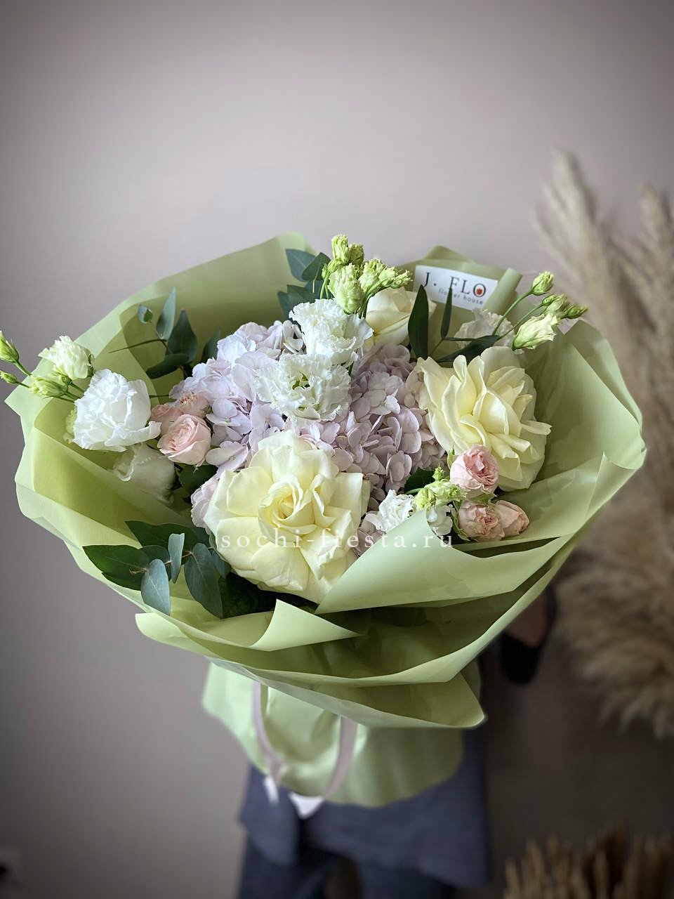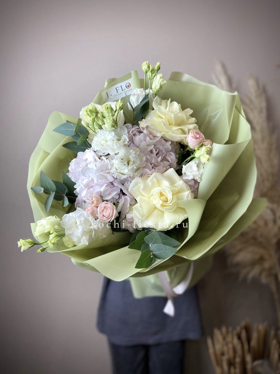 гортензия, эустома, белые французские розы, эвкалипт, авторское оформление.