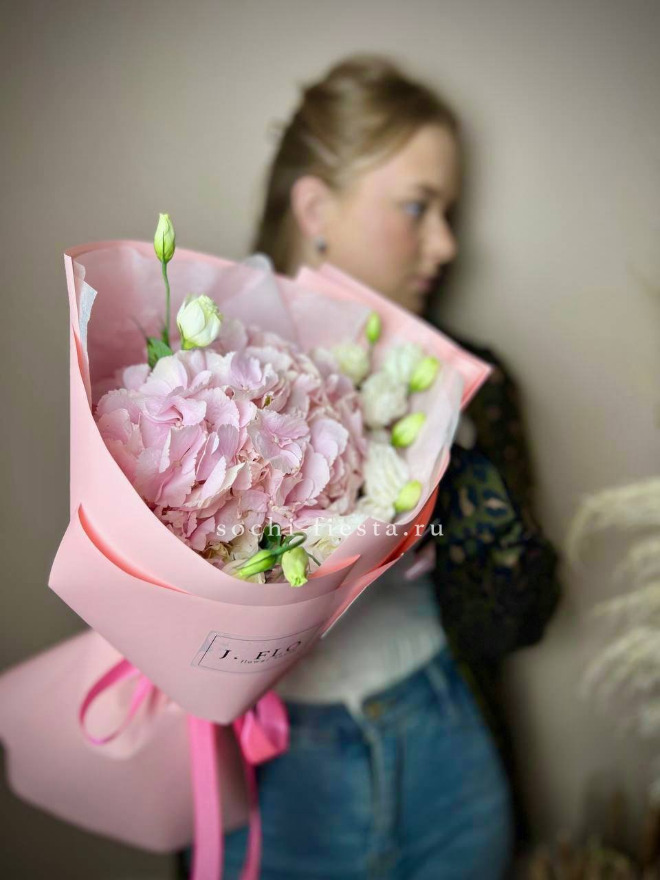 Букет с гортензией и белыми французскими розами