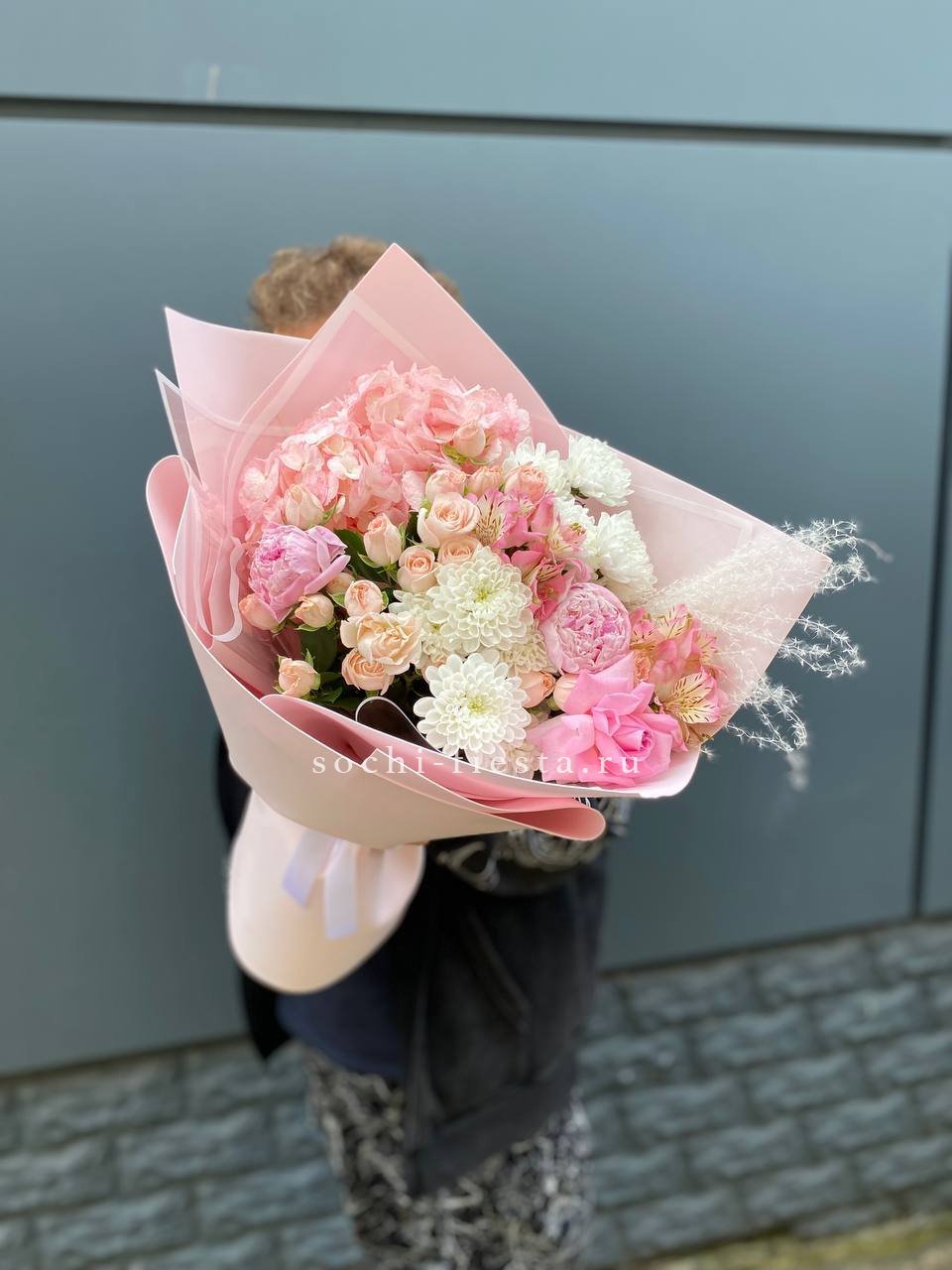 пионы, гортензии,розы кустовые,альстромерии,  лента и дизайнерская пленка.