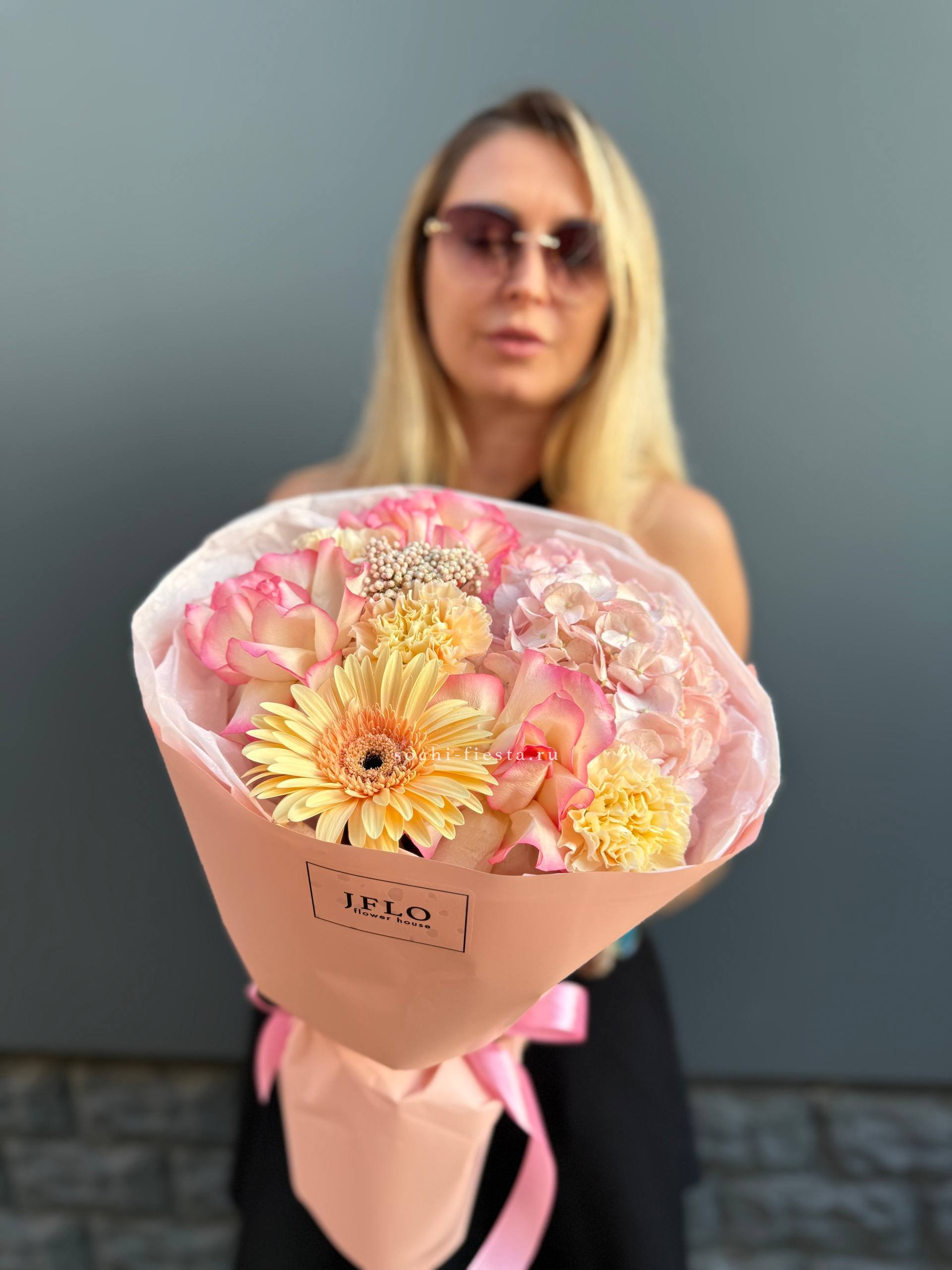 Яркая композиция собрана из гербер, роз Джумилия и воздушной гортензии. Диантус и озотамнус добавляют фактурности, создавая объёмный силуэт с живописной глубиной.