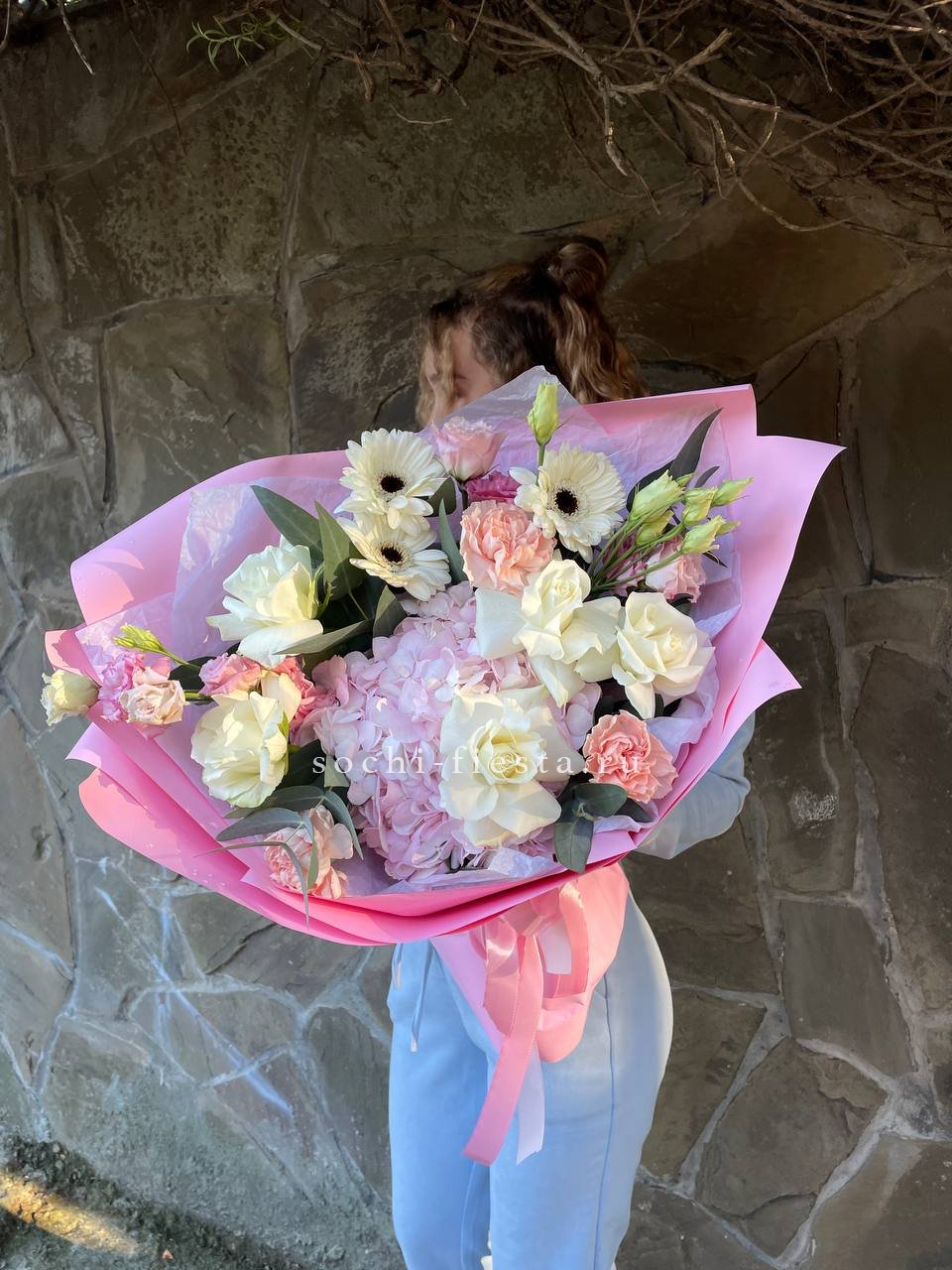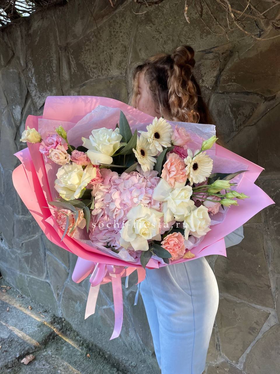 Кремовые розы окружены облаками гортензии, а эустома расставляет светлые акценты по краям. Букет держит форму и при этом выглядит объемно благодаря многослойной сборке.