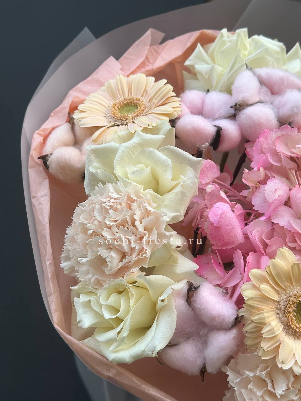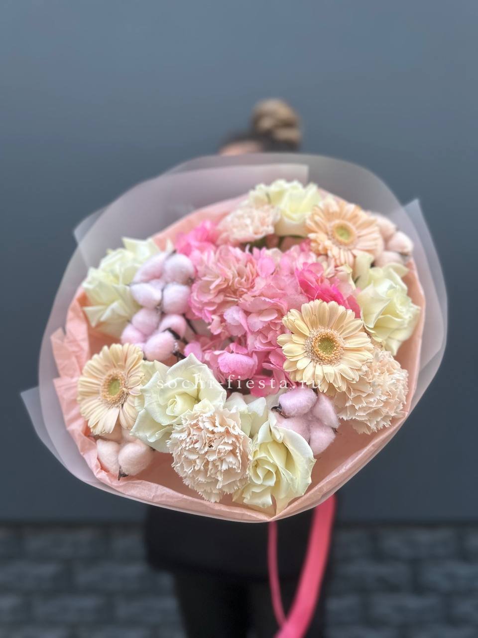 Лёгкая композиция с гортензией и гвоздикой дарит ощущение весеннего утра. Цветы подобраны так, что букет выглядит непринуждённо и свободно.
