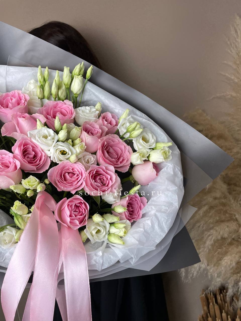 Диантусы и кустовые розы создают воздушную композицию с мягкими переходами оттенков. Бутоны распределены свободно, образуя естественный силуэт без жесткой геометрии. Букет хорошо держит форму и долго сохраняет свежесть.