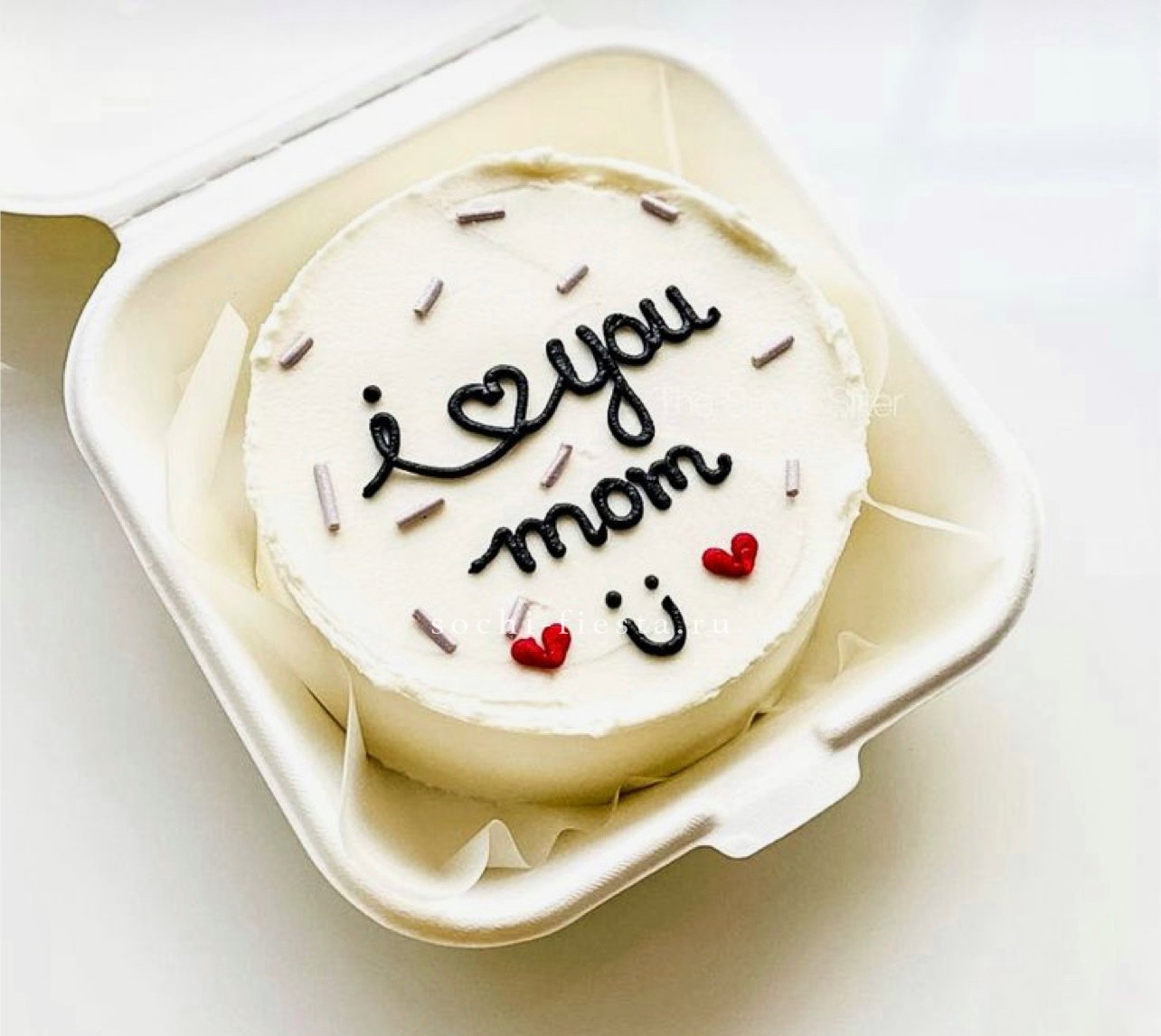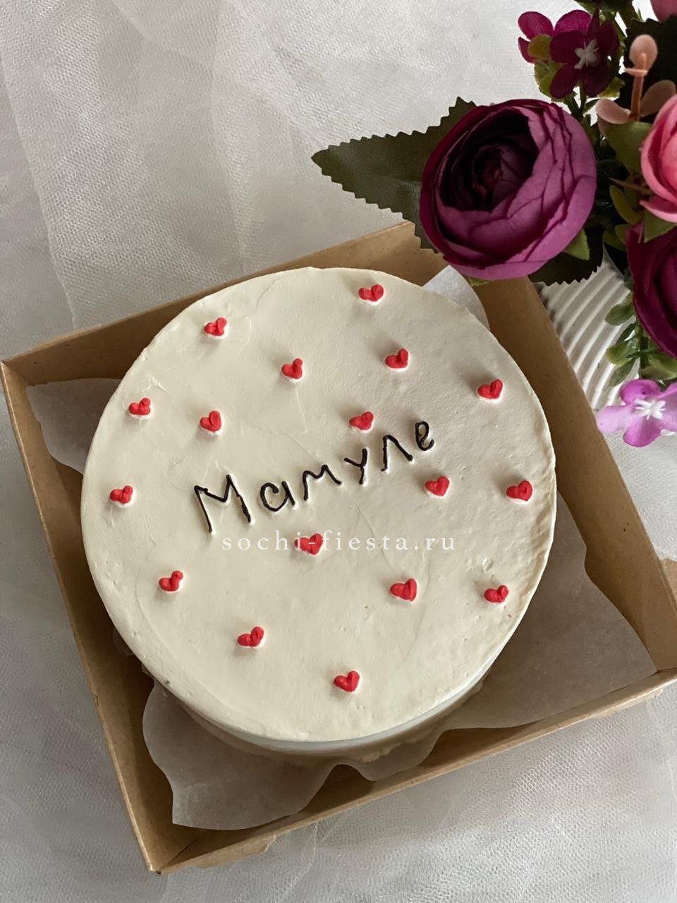 Миниатюрный торт с яркой надписью и домашним теплом в каждом слое. Крем держит форму, а бисквит остается влажным благодаря небольшому объему и свежести выпечки.
