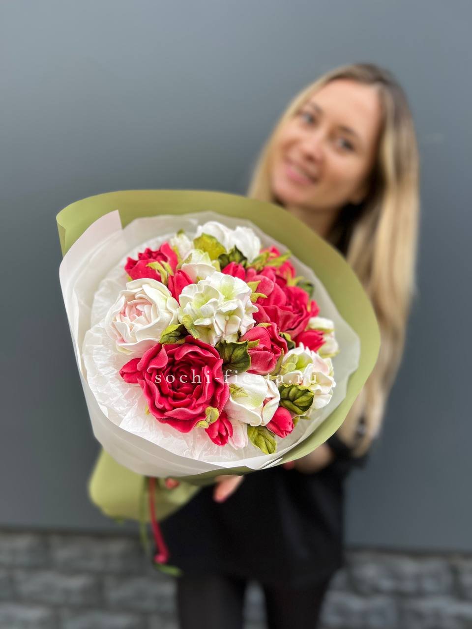 Букет из зефирных лепестков в насыщенных тонах собран на натуральных компонентах. Яркая палитра и воздушная текстура создают весёлое настроение без единого увядшего бутона.